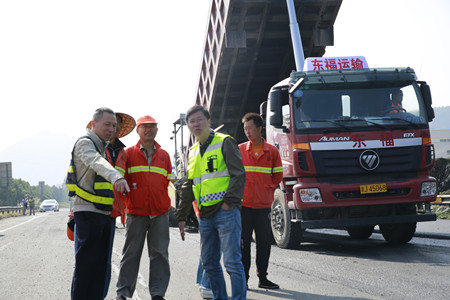 在公司路段寧向K1643+800處左右,路面銑刨作業(yè)正在緊張地進行著,張建平看到施工人員在銑刨車上駕駛著,監(jiān)理單位工作人員在現(xiàn)場低頭觀察著,工程養(yǎng)護部監(jiān)管人員王劍也認(rèn)真地盯著銑刨車經(jīng)過的路面……“辛苦了!”張建平上前與大家打了聲招呼。然后向大家了解當(dāng)天的工程安排和進度,以及正在進行的施工作業(yè)情況,詢問了有哪些困難和問題,提出了一些施工中的注意事項,特別強調(diào),要注意安全,要視質(zhì)量為生命,務(wù)必保質(zhì)保量地完成養(yǎng)護攻堅工作。