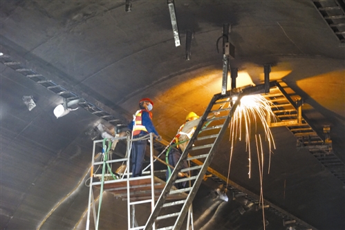 另一處作業(yè)面,負(fù)責(zé)焊接的王師傅拿著器械,正目不轉(zhuǎn)睛地盯著焊接面。“焊接對(duì)精度技術(shù)要求很高,焊縫還要檢測(cè),得一次成型,否則施工就不合格。”從事多年電焊工的他常常腰酸腿疼,落下“身疾”,“不過(guò)時(shí)間久了也就習(xí)慣了,堅(jiān)持就是勝利。”王師傅依然很樂(lè)觀地看待自己的工作。