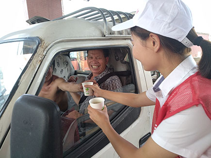 圖為志愿者合影 志愿者們兵分三路,一路在外廣場對滯留車輛進行文明勸導,一路拿著垃圾袋和撿拾工具沿收費區域收集垃圾,另一路則在安全島上向過往的司乘人員宣傳夏日行車安全知識,同時提供礦泉水、冰鎮綠豆湯,發放清涼油、風油精等防暑降溫用品,不僅為司乘人員提供熱情周到的服務,還讓過往司乘人員在炎炎夏日真切感受到一絲清涼和一份關心。 該所通過開展一系列的志愿活動,促進了收費員與司乘人員之間的溝通交流,拉近了彼此之間的距離,贏得了過往司乘人員的好評,塑造了良好的窗口形象,為臺州市創建全國文明城市貢獻力量。 鄭瑛芝