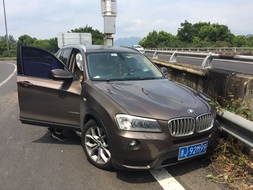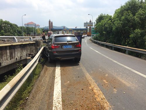 8月13日上午10:30分左右,臺州收費所出口寧向匝道口有一輛黑色寶馬X3斜靠在護欄旁,其車頭左側(cè)因碰撞護欄而嚴重凹陷,左前輪胎報廢。 當(dāng)時,該所出口五號車道的欄桿發(fā)生故障,需要暫時關(guān)閉進行維修。班長張海勇在內(nèi)廣場引導(dǎo)車輛時發(fā)現(xiàn)此起事故,走近細看,由于碰撞激烈該車前檔玻璃破裂,前排安全氣囊彈出,而車旁的兩個人驚恐未定不知所措。此時匝道口車流不斷,因駕駛員遲遲找不到三角牌,為避免二次事故的發(fā)生,張海勇在車后方指揮交通,并提醒車旁人員站在護欄外安全位置,同時報告指揮中心事故車的位置和損傷情況。