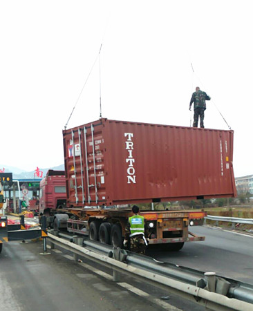 12月15日10:10分左右,一輛車牌為浙B88C06的集裝箱車在臺(tái)州南副站選擇出口車道時(shí),因變道和出口運(yùn)載汽車的長(zhǎng)掛車發(fā)生碰撞,使得未鎖牢的集裝箱箱體甩落下來(lái),砸到護(hù)欄及進(jìn)口一輛正在通行的貨車車頭,造成護(hù)欄變形、貨車車頭受損嚴(yán)重,所幸無(wú)人員受傷。