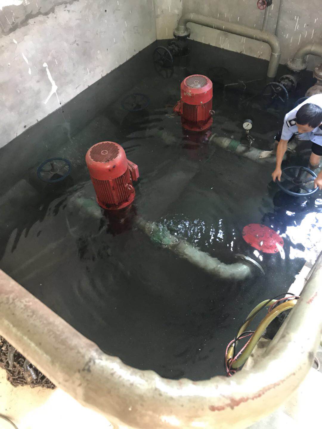 圖為執(zhí)勤隊員在關(guān)閉閥門 “看,應(yīng)該是這里漏水了,有水暈在動。” “對,就是這里了。” “水馬上要沒到電機(jī)了,趕快關(guān)閉閥門,不然損失就大了。” 此時,陳旦平?jīng)]有多想,立即下水去關(guān)閉水泵閥門。池中有2號泵的高位水池閥門和2號泵的集水池閥門,每個泵各有兩個閥門。陳旦平在迅速關(guān)閉閥門后,由于集水池這邊地勢較低,慌忙中的他忘拿手機(jī),手機(jī)被水浸到,他卻依舊埋頭于搶修。 據(jù)隊長李新波說,此次“水災(zāi)”是北泵房2號泵的壓力表處水管漏水,原因是設(shè)備設(shè)施使用時間較長,水管陳舊銹蝕,抵不住水壓,導(dǎo)致水管開裂,引起漏水。 胡瑰華