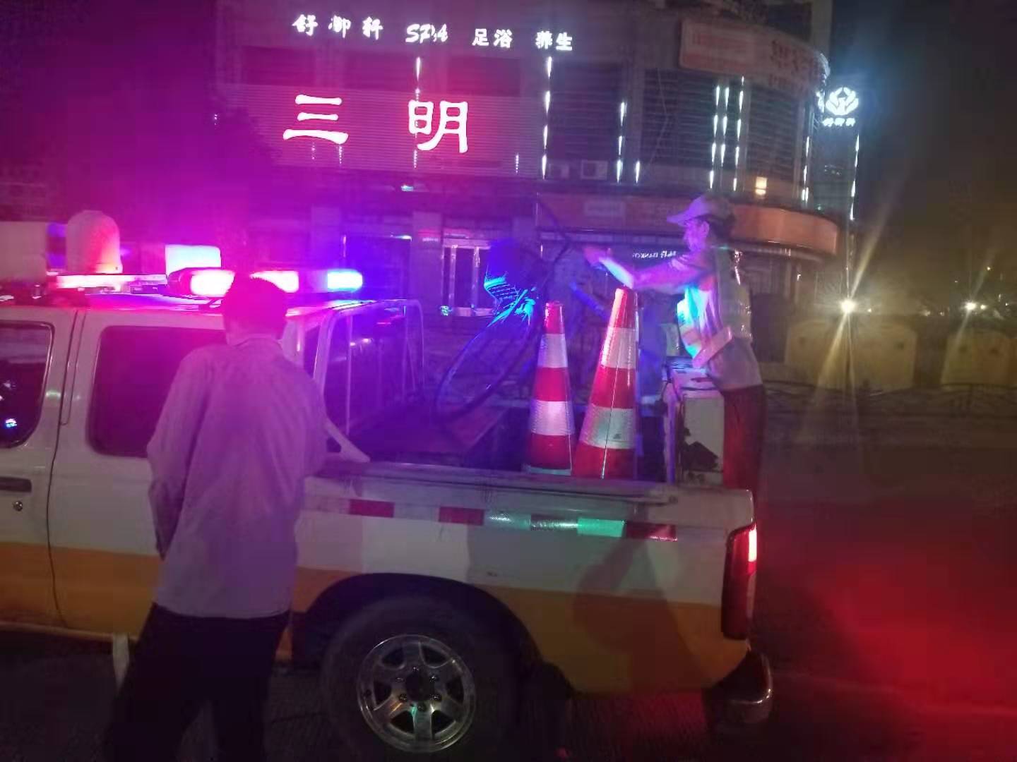 圖為執(zhí)勤隊發(fā)現(xiàn)騎車人 9月24日21:09分,大溪嶺隧道所中控室發(fā)出通知。執(zhí)勤隊員接中控指令,迅速出警。晚上九點,在高速公路上找人,需得打上12分的精神,巡邏車放慢車速,坐于后座的隊員們緊盯著車道兩旁,終于在21:14分,距離寧向隧道出口一公里處發(fā)現(xiàn)該騎車男子,隊員們立即上前將其攔住。眼前的一幕令執(zhí)勤隊員嚇出一身冷汗,該男子左手殘疾,單手騎車,晚上視線模糊,且高速公路上車多,速度快,司機很難發(fā)現(xiàn)有行人,如發(fā)現(xiàn)躥出來的行人而采取緊急制動,會造成多起追尾事故,現(xiàn)場情況非常危險!隊員們合力將自行車抬上車。