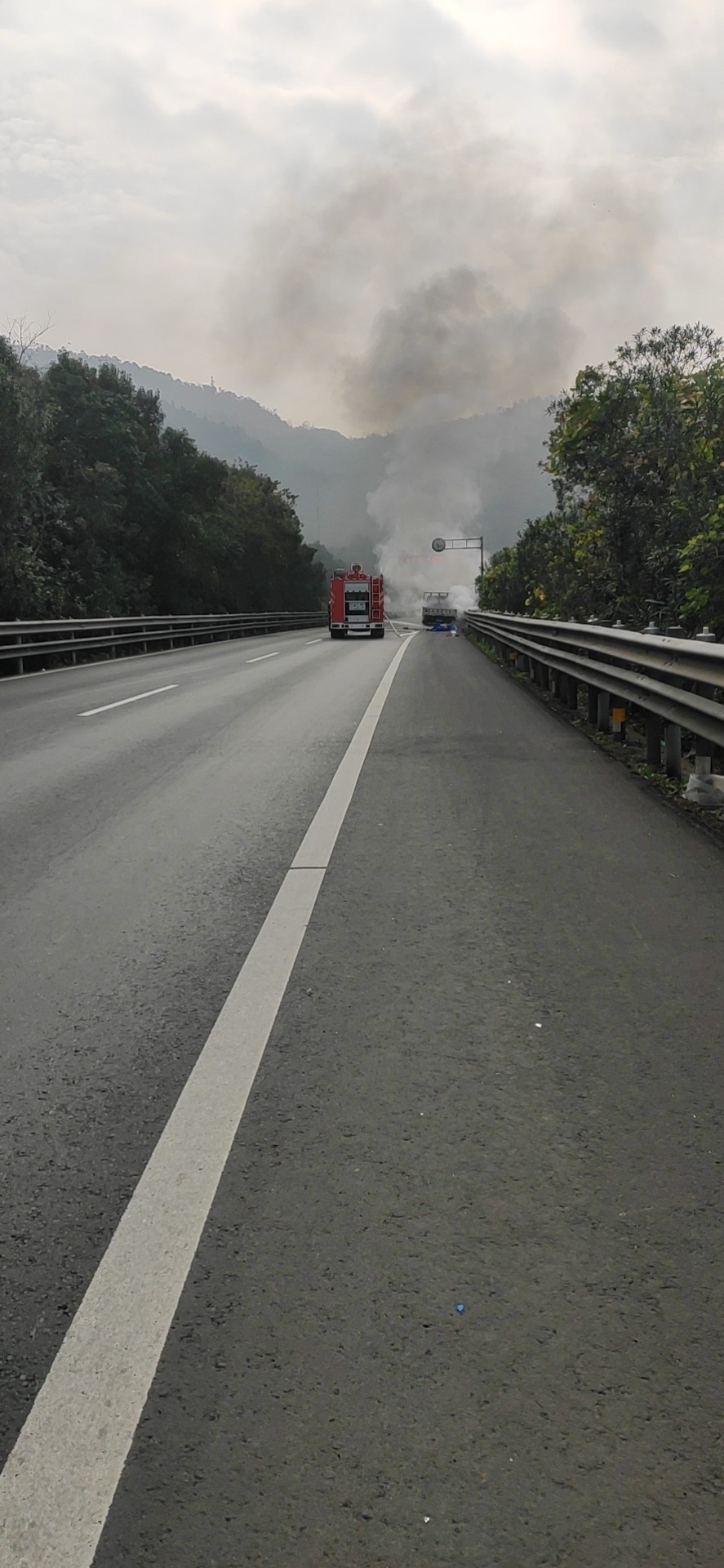 12月13日12:48中控發(fā)現(xiàn)溫向隧道入洞口600米處的情報(bào)板下濃煙滾滾,中控切換火災(zāi)圖像至監(jiān)控中心。并啟動(dòng)火災(zāi)報(bào)警系統(tǒng),按下火災(zāi)按鈕,由于著火點(diǎn)距離隧道北廣場(chǎng)最近的消火栓有500百米,隊(duì)員們出警時(shí)從倉(cāng)庫(kù)里取出數(shù)只滅火器,由于車輛未實(shí)施封道,車輛一直在事故車旁邊呼嘯而過(guò),給現(xiàn)場(chǎng)救援帶來(lái)難度,王宇鵬、湯寧光、陳幸?guī)е鴾缁鹌黠w奔去滅火,巡邏車準(zhǔn)備駛?cè)胧鹿受嚭筮M(jìn)行封道預(yù)警。