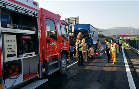 4月19日上午6點10分,寧向大溪出口正在進行分流,所有車輛正緩慢前行中,一輛贛F38***牌照的藍色大貨車顯然還沒有適應這分流的節奏,“砰”地一聲猛然撞上了前面的大貨車。 兩個“大家伙”碰撞的威力非同小可,直接的后果就是后車的車頭變形,損傷極大,貨車駕駛員被卡在車頭里出不來。 時間就是生命,施救中心迅速出動,配合交警、消防部門在現場進行預警,并協助進行事故處理。