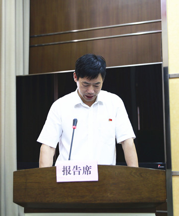 圖為公司副總經理陳保衛宣讀《關于轉讓臺州高速泰和房產公司股權的議案》