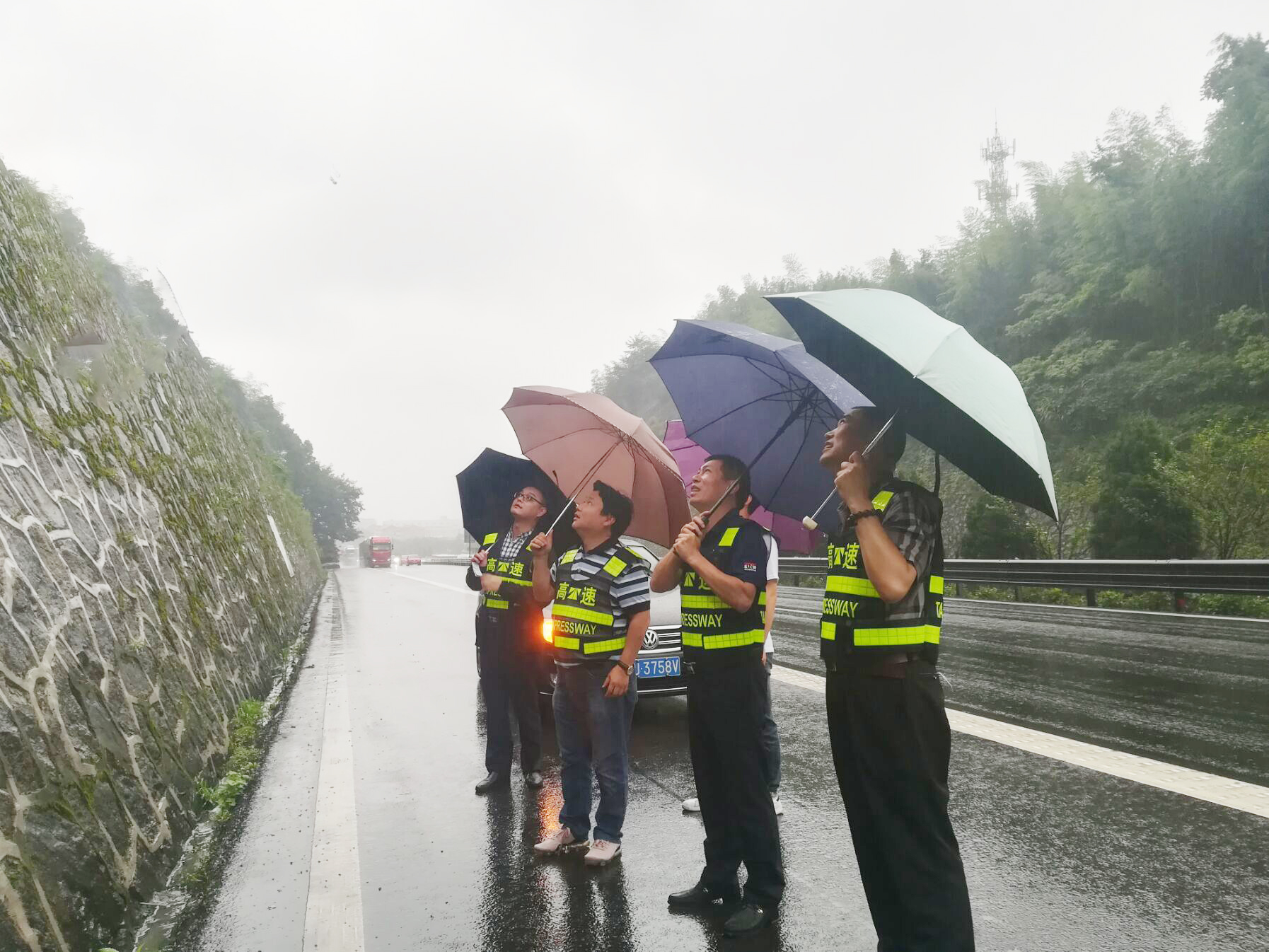 圖為集團總工程師江輝帶領道路安全檢查組檢查現場 集團總工程師江輝帶領道路安全檢查組到沿線查看黃土嶺隧道北洞口高邊坡情況,以及大溪嶺隧道管理所消防集水池進水管被堵塞情況,研究確定整改方案,落實整改工作。