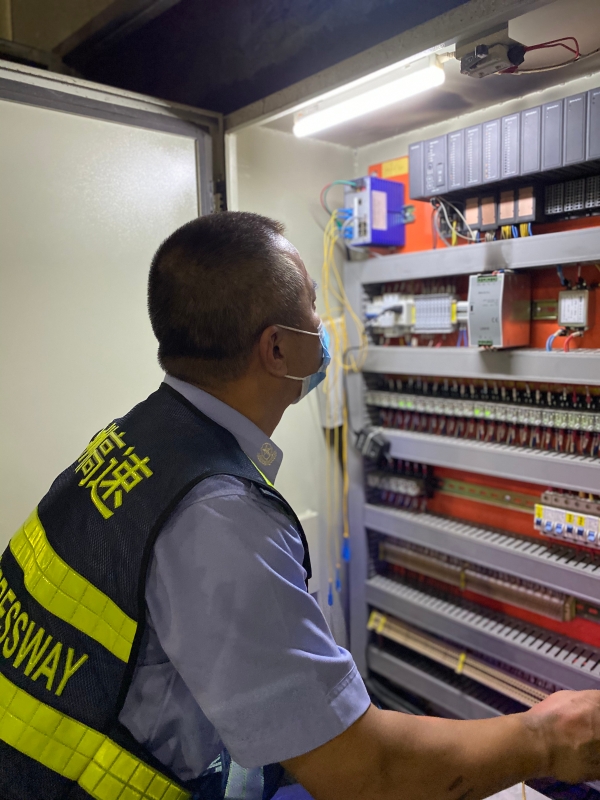 雖然隧道內(nèi)沒有烈日的灼燒,但日均4萬的車流,加上尾氣排放,導(dǎo)致隧道內(nèi)的氣溫遠(yuǎn)高于室外。當(dāng)室外37°C時,整個隧道里宛如一個蒸籠。盡管如此,廣場上、電纜溝上隨時都有執(zhí)勤隊(duì)員忙碌的身影。他們來回徒步穿梭于隧道,檢查指示燈、消防設(shè)備箱、緊急電話、火災(zāi)報警等設(shè)施設(shè)備,排查各類安全隱患,修復(fù)受損設(shè)備,處理各種突發(fā)情況。一趟下來臉和胳膊被熏得黝黑,口罩、衣服濕了又干、干了又濕,盡管工作量大、強(qiáng)度高,他們從不喊苦說累。