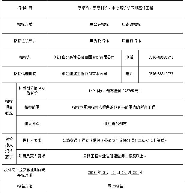 高埭橋、新高村橋、中心路橋橋下限高桿工程招標(biāo)公告