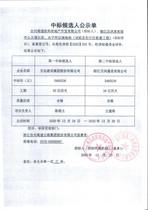 椒江區洪家街道中心大道以東、永寧河以南地塊(試樁及先行區樁基工程)中標候選人公示單