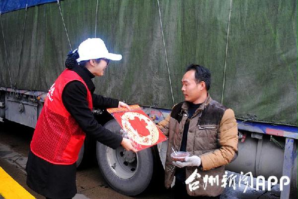 圖為志愿者為司機送上“福”字。鄭瑛芝攝